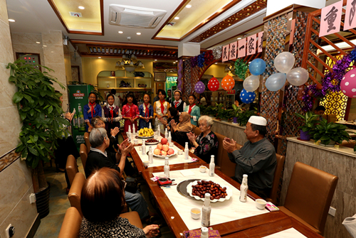 接着,在宁夏马记彭浦清真饭店举行了“爱心邮包”派送仪式,街道领导和居住在彭浦新村街道的20余名年过8旬的老归侨、少数民族老人代表及藏族学生欢聚一堂,学生们用他们美妙的歌声向在座的爷爷奶奶表达孝亲之情和节日祝福;街道领导带着诚挚的慰问将“爱心邮包”(价值200元的清真牛羊肉券和100元的清真面券)传递给了街道老归侨及少数民族族代表,在座的老人也表示:每年这个时候都有人挂念我们,同我们一起过节,社区没有忘记我们,我们很高兴。“爱心邮包”的活动不仅给少数民族困难家庭带去了生活上的帮助,还会及社区老归侨,让他们感受到社区的温暖和党的关怀,体现了民族大家庭的温暖;;活动最后,几十碗热腾腾的长寿面,饱含了街道领导、社区和学生的对长者的敬重之情,一挂长寿面,殷殷重阳情,使节日的氛围更加浓郁。