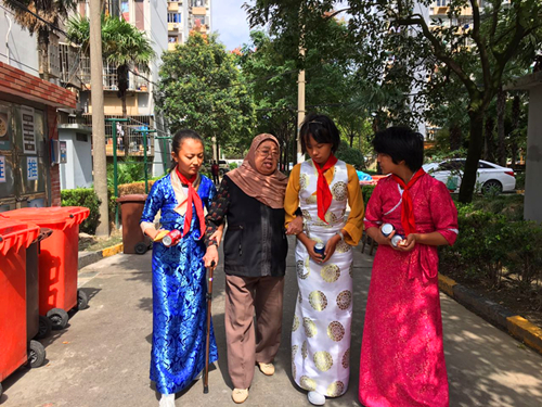 10月9日上午,彭浦新村街道领导、统战干部、居委会书记带领共康中学的藏族学生们首先来到老归侨杨老伯及少数民族“老买热线”创始人买玉秀家中,为他们带去节日的慰问和祝福,祝老人身体健康、晚年幸福,藏族学生的祝福词和提供的家务劳动服务,让老人们深感欣慰,露出了慈祥的笑容。