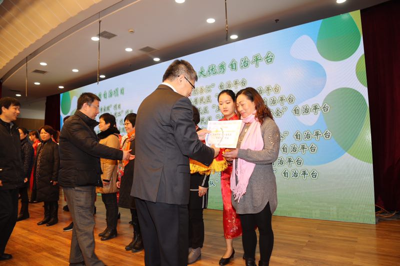 风采展示环节,居民区代表通过“照片里的自治故事”向大家展示了社区的风采,街道为本年度十大优秀自治项目与十大优秀自治平台代表进行了表彰并颁发了奖杯奖状。同时,街道办事处主任章钧还与点赞网签订了2017年战略合作协议,通过网络点赞行动扩大居民参与,这种战略上的跨界合作也是自治模式创新的重要部分。