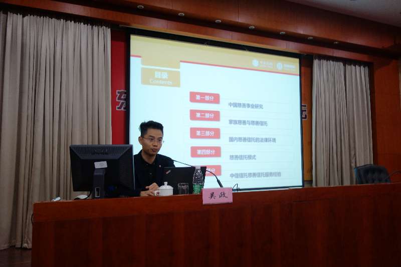 培训特邀请中信信托有限责任公司市场管理部主任吴政老师主讲,分别从“中国慈善事业研究、家族慈善与慈善信托、国内慈善信托的法律环境、慈善信托的模式、中信信托慈善信托服务的经验”等五大模块,结合《民政部中国银行业监督管理委员会关于做好慈善信托备案有关工作的通知》进行授课,详细解读政策,分享实际案例及慈善信托的基本架构和业务规划、方案,深入浅出地阐述了《慈善法》的施行对中国慈善事业的影响以及慈善信托与社会组织的合作。课后,与会人员对有关问题进行了及时有效的互动交流,会场气氛热烈。