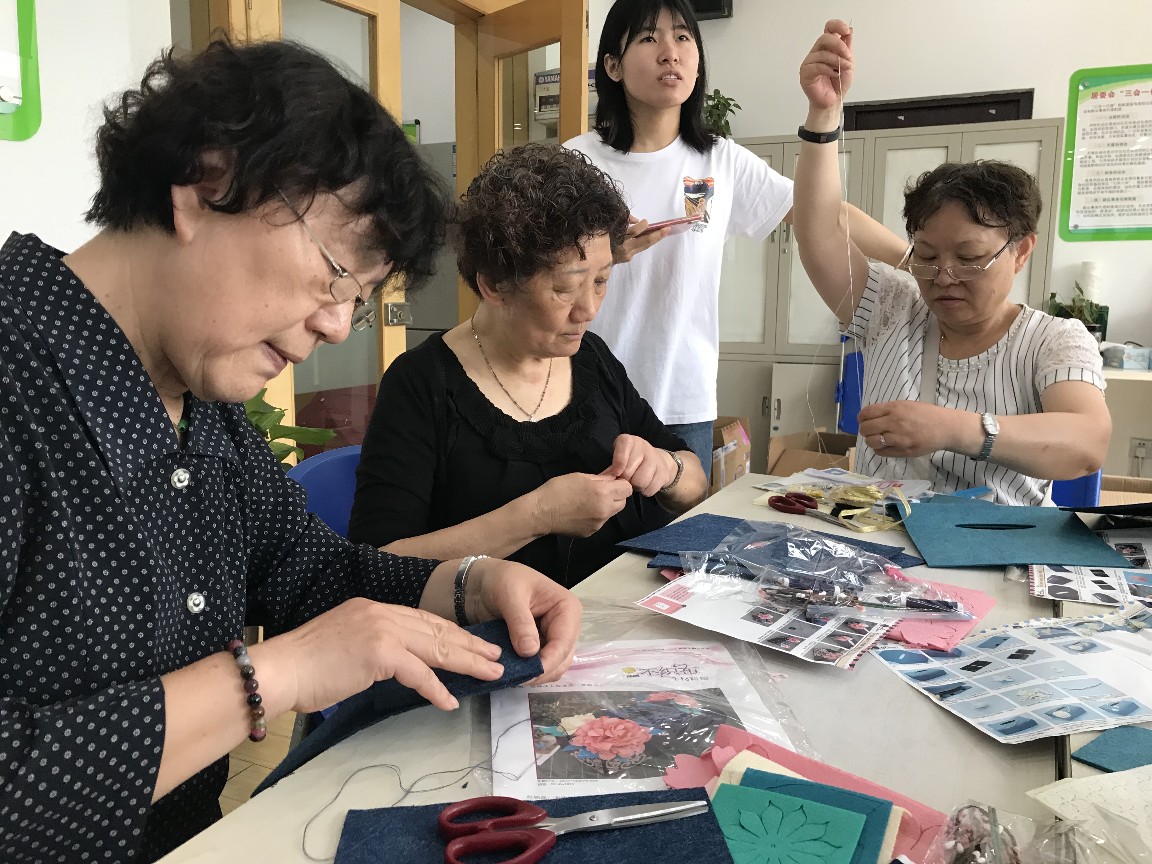 此次手工DIY是制作餐巾纸盒,老人向大家展现了如何将不起眼的针线变成生气与活力,美观与实用的生活用品。老年人一边听讲解一边动手实践,看似复杂的制作程序,一一化解。经过近两个小时,一个个颜色鲜艳、样式可爱的餐巾纸盒就“新鲜出炉”,大家看着自己亲手制作的作品满怀喜悦,爱不释手。