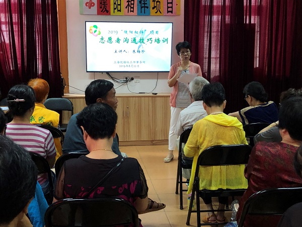 8月22日,上海欣扬社工师事务所在临汾路街道闻喜路251弄老年活动室举办“暖阳相伴”项目志愿者沟通技巧培训。项目负责人朱梅珍老师进行理论讲解和实务指导,27名项目志愿者参与培训。