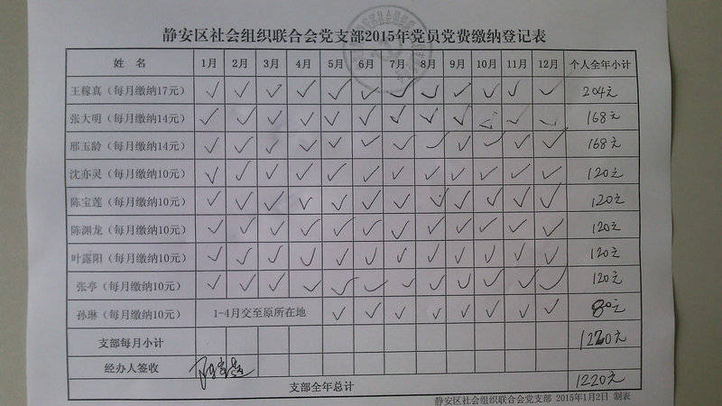 区社联会党支部2015年党员党费缴纳情况汇总