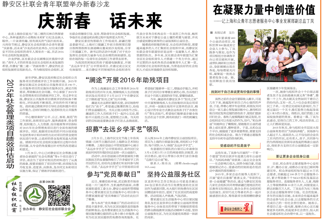 随着政府职能的转变、社会经济的转型,需要越来越多的人才汇集到社会组织中来,而静安区社联会青年联盟恰好是这样一支凝聚人才,整合资源的队伍。多年来,区社联会青年联盟为汇聚全区社会组织青年人才搭建一个有力平台,通过不定期的沙龙和各类活动凝聚青年人汇聚一堂,共同探讨社会组织的发展,为营造良好的社会组织人才成长环境提供支持和保障。