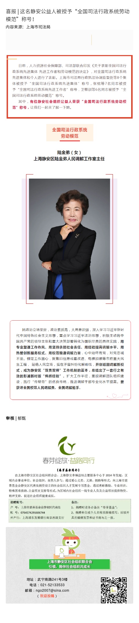 喜报 _ 这名静安公益人被授予“全国司法行政系统劳动模范”称号!