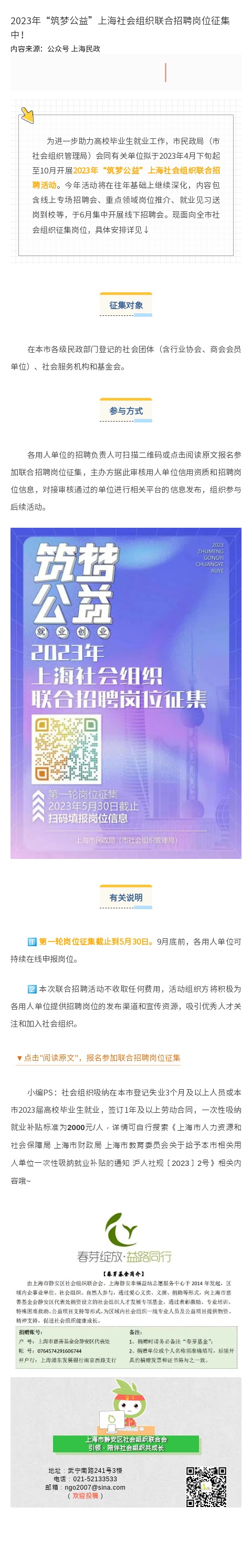 2023年“筑梦公益”上海社会组织联合招聘岗位征集中!