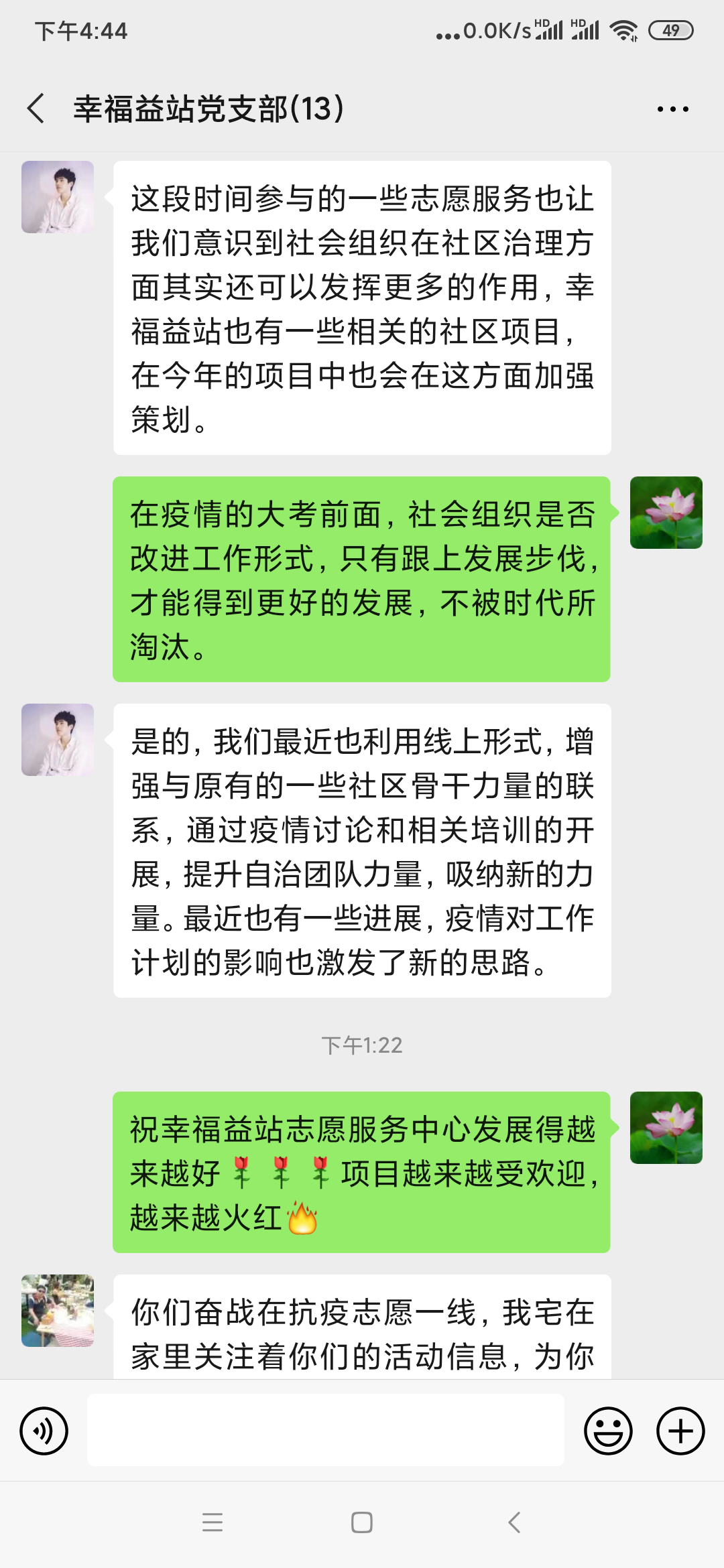 党员们纷纷表示践行初心使命,必须做到慎终如始,社会组织在参与社区治理方面应该发挥更大作用。突发疫情激发了社会组织工作新思路,考验了社工的综合能力,共产党员更要有“永在路上”的进取感,以实际行动助力社会组织公益事业发展。