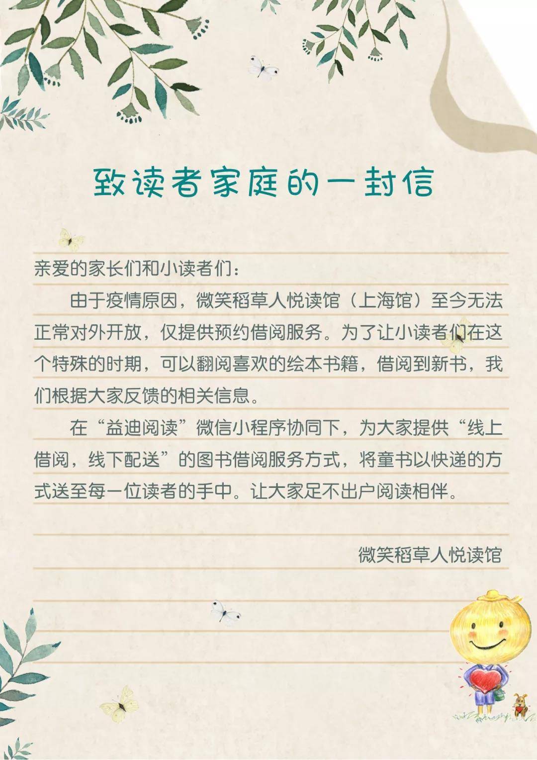 在进行下述操作前,请先确认是否已办理了“微笑稻草人悦读馆(上海馆)图书借阅卡”,如果无借阅卡的家庭需要进行书籍借阅,可以在借阅群内联系工作人员,进行在线实体借阅卡办理(未办理借阅卡则无法进行书籍借阅);