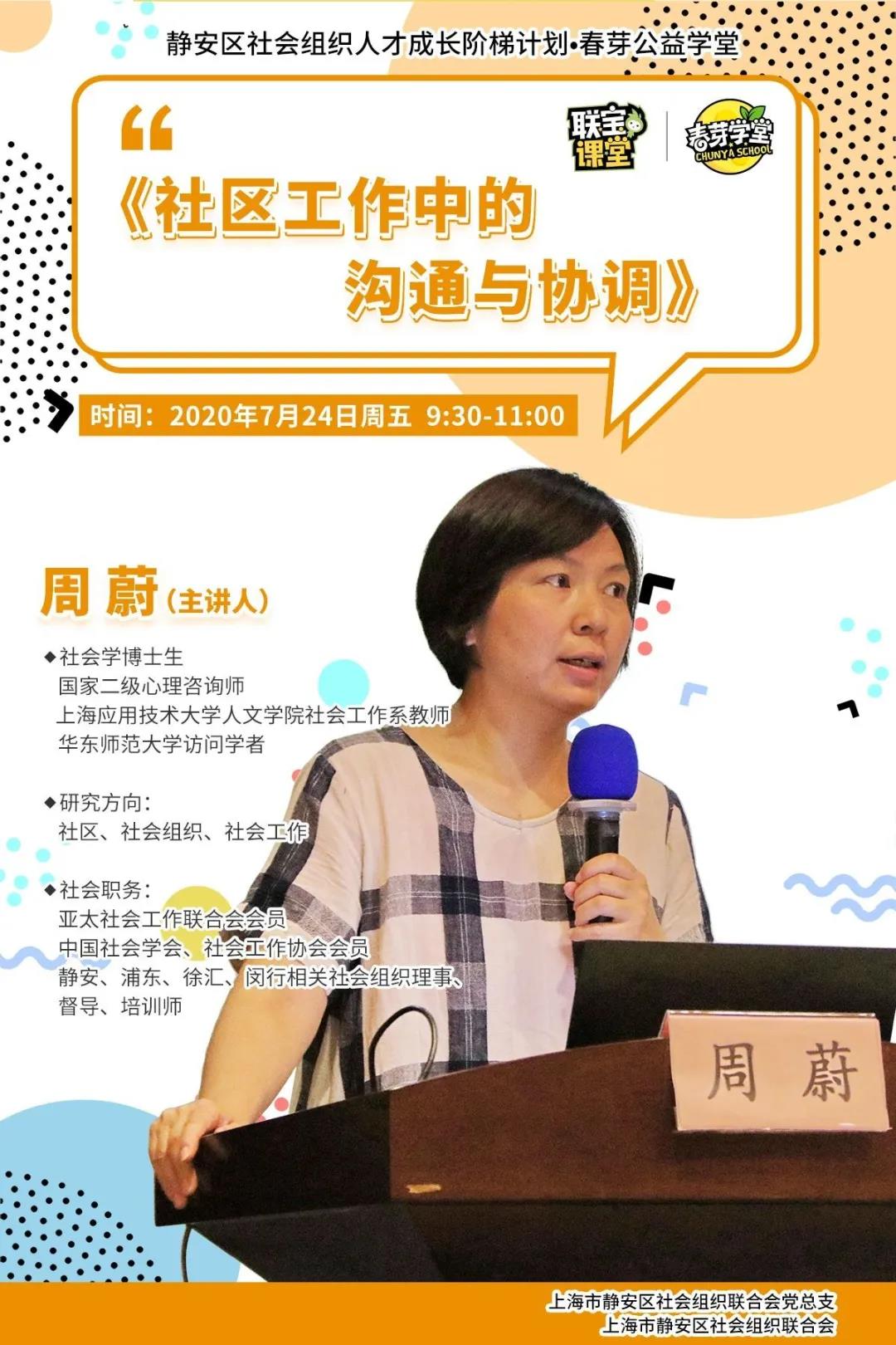 7月24日,由静安区社会组织联合会党总支、静安幸福益站志愿服务中心主办的2020年第四届“春芽基金”公益学堂第三课如期开展。本次课程邀请到了上海应用技术大学人文学院社会工作系的周蔚老师,由她带领春芽学员和公益小伙伴探索社区工作中沟通与协调的奥秘。