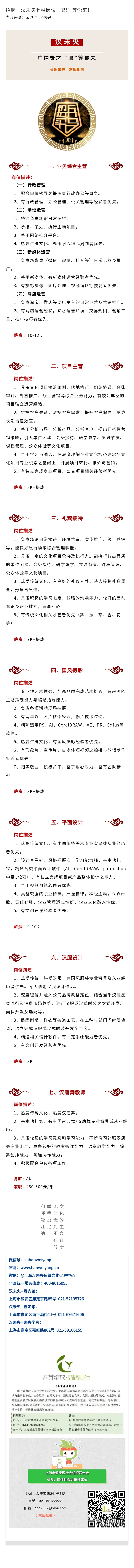 【招聘启事】招聘丨汉未央七种岗位 “职”等你来!