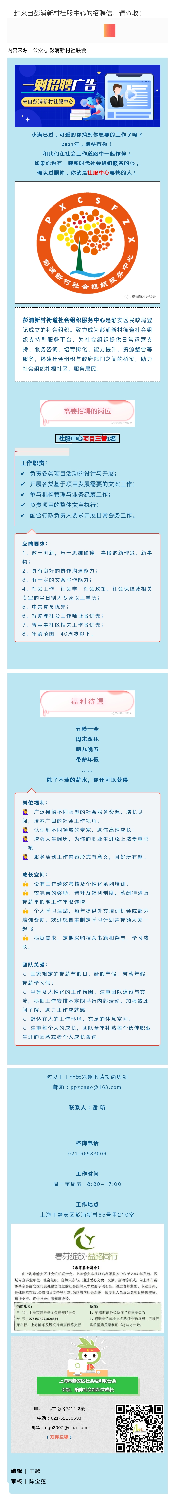 【招聘启事】一封来自彭浦新村社服中心的招聘信,请查收!