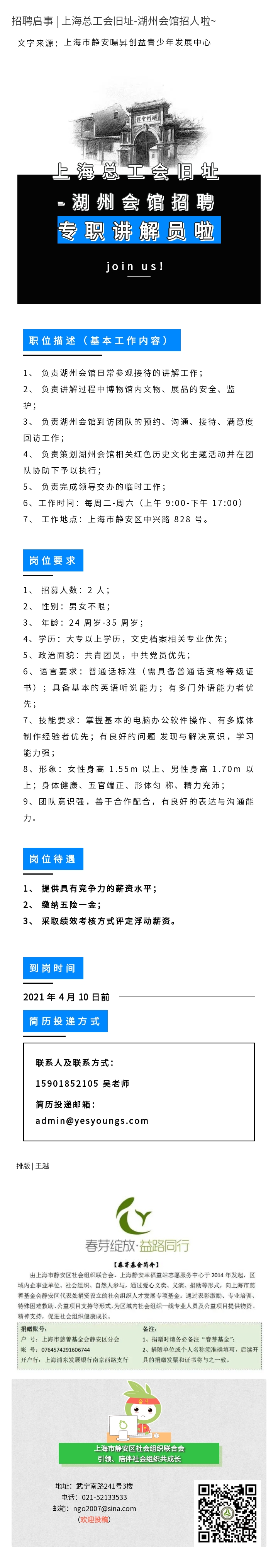 【招聘启事】招聘启事 | 上海总工会旧址-湖州会馆招人啦~