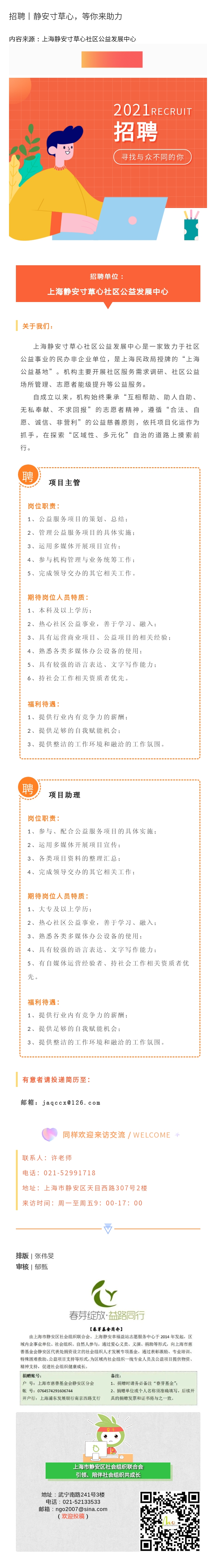 招聘丨静安寸草心,等你来助力