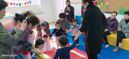 艺术领域:音乐《拉个圆圈走走》学会欣赏音乐,并跟着老师做动作,运用小乐器,培养节奏。