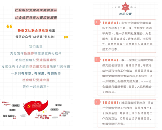 静安区社联会党总支推出微信公众号“益党建”专栏,有《党建动态》、《党建风采》、《益论党建》三大版块,各党支部要依托区社联会党建新平台,加强交流和学习,积极参与投稿,展示大宁社会组织党建风采。