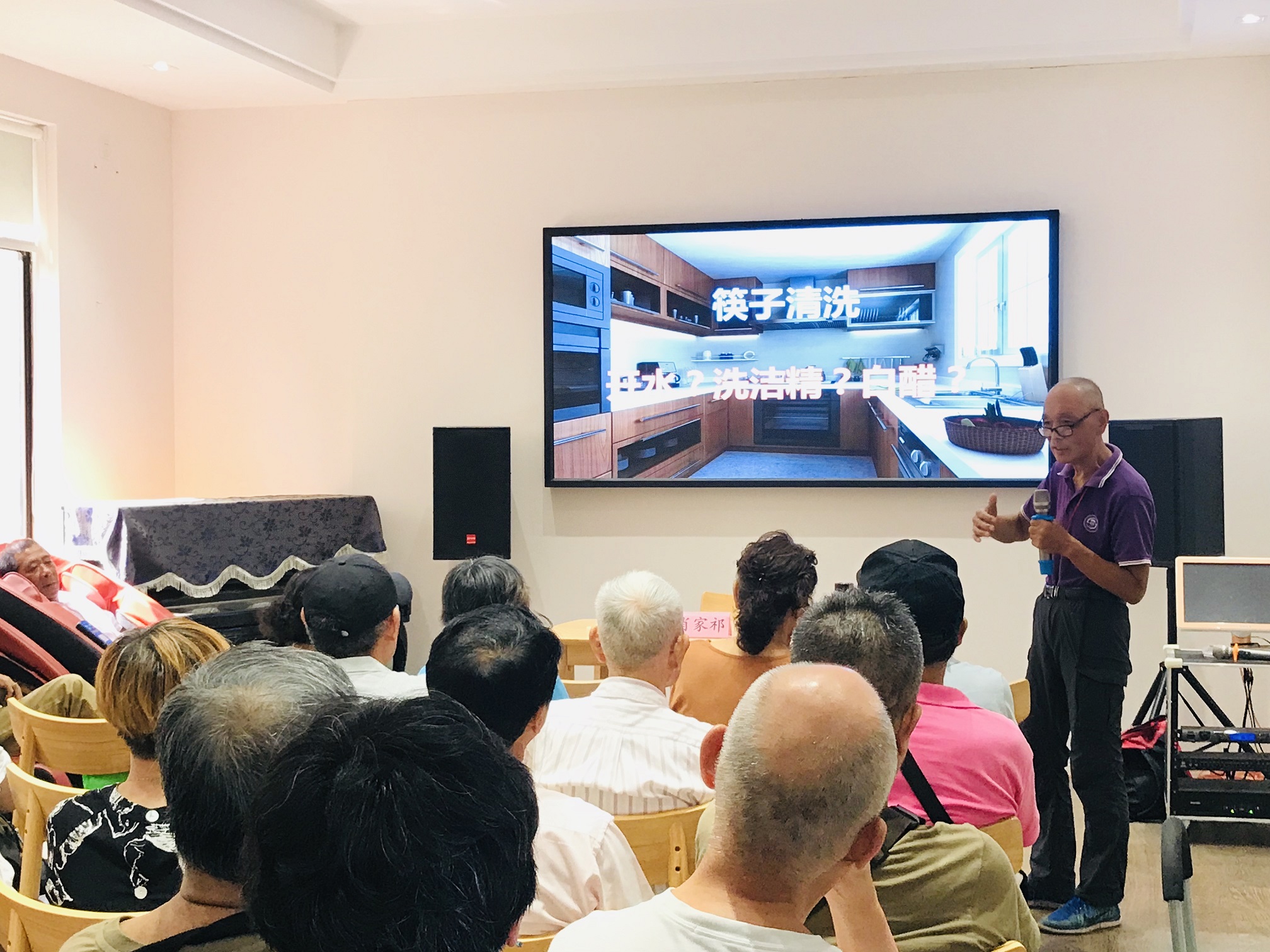 肖老师首先介绍了杀灭细菌的原理:一是要断绝细菌的营养物质,二是要隔绝细菌赖以代谢的水分;进而提到了“抗菌”、“抑菌”、“消毒”、“灭菌”四个杀灭微生物的不同标准,不但普及了科学知识,对于大家合理挑选市面上林林总总的消毒产品,也有一定的帮助。最后,肖老师针对洗碗布、筷子、砧板这三件最易“藏污纳垢”的厨具,讲解了材质的挑选和抑菌、消毒的有效方法。