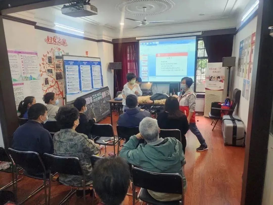 在世界红十字日来临之际,南西红十字服务总站在静安区红十字会的协助下,采取全覆盖的形式在辖区12个居委中开展公益救护培训。活动现场培训老师除了系统的讲解理论知识外,还与居民积极互动,在实践操作中,将居民分成不同的小组开展心肺复苏、AED的操作和创伤包扎等实操练习,并利用模拟人道具和急救教具,指导居民们进行规范操作,巩固学习内容,提升了居民自救呼救、应急避险的能力。