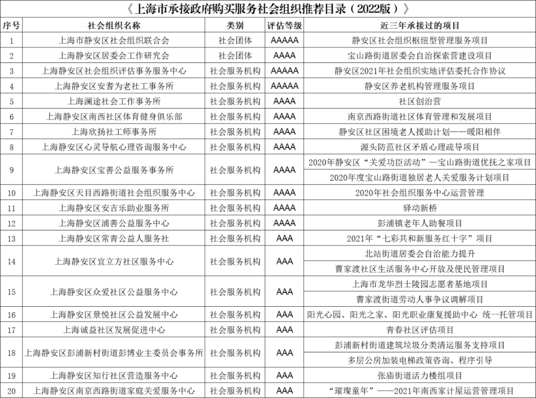 【2022.11.03】 重磅发布!全市253家社会组织入选,让供需对接更精准! 发布时间:2023/10/10 13:39:27 浏览次数:255 由上海市民政局(上海市社会组织管理局)指导、市社会组织服务中心具体负责的2022年度上海市承接政府购买服务社会组织推荐目录工作,历时三个多月,经社会组织自荐、区级初审、市级复核以及公示等环节,20家静安社会组织承接的24个项目入选。