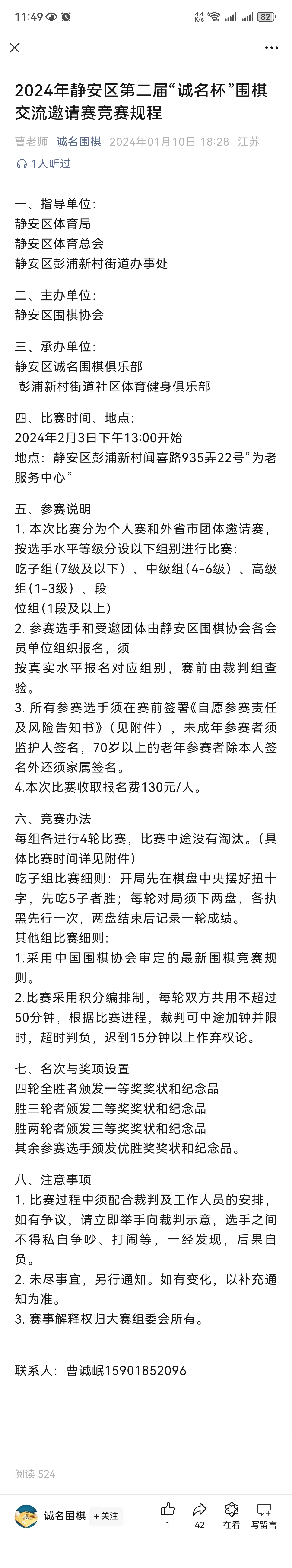 2024年静安区第二届“诚名杯”围棋交流邀请赛竞赛规程